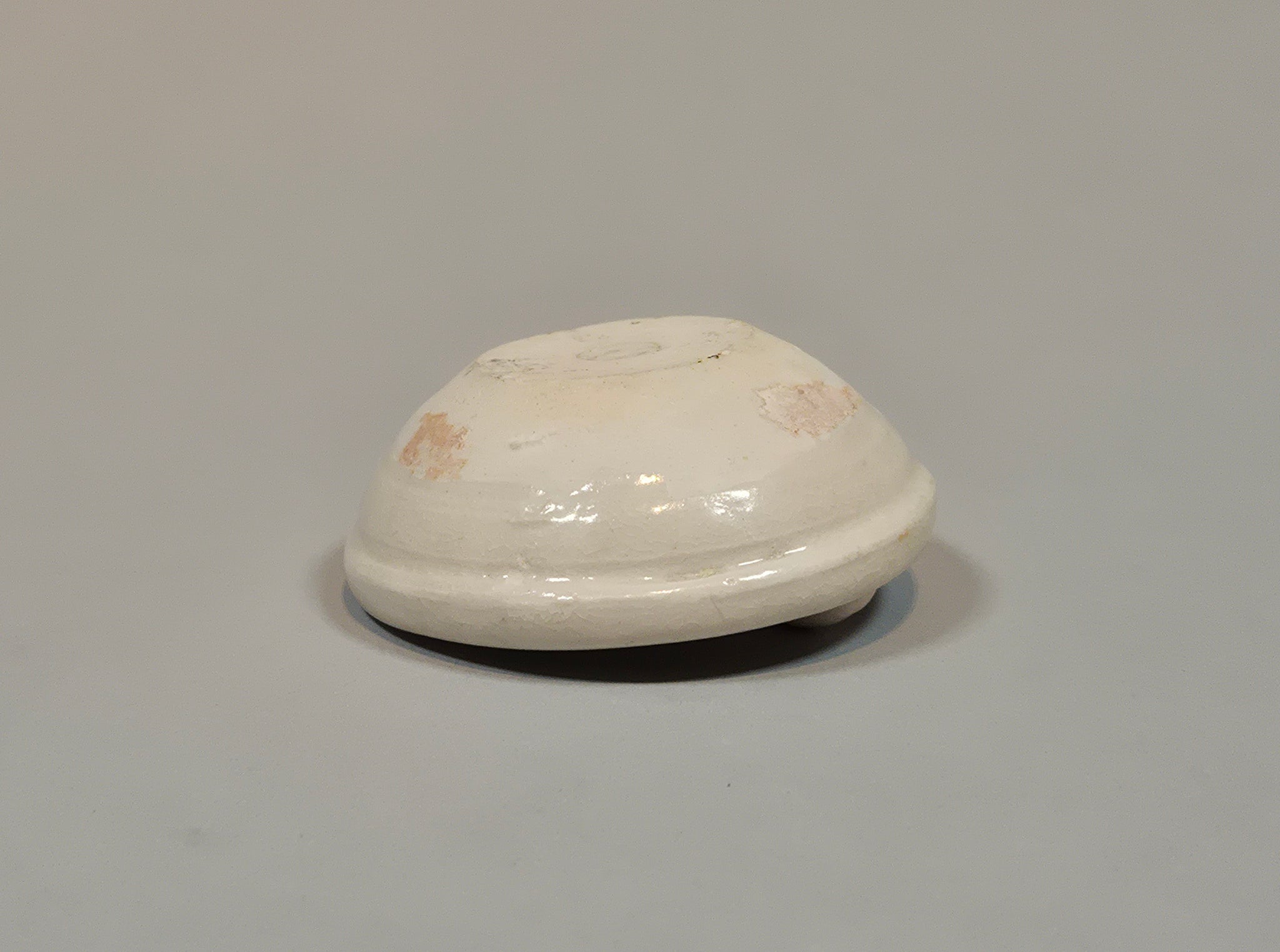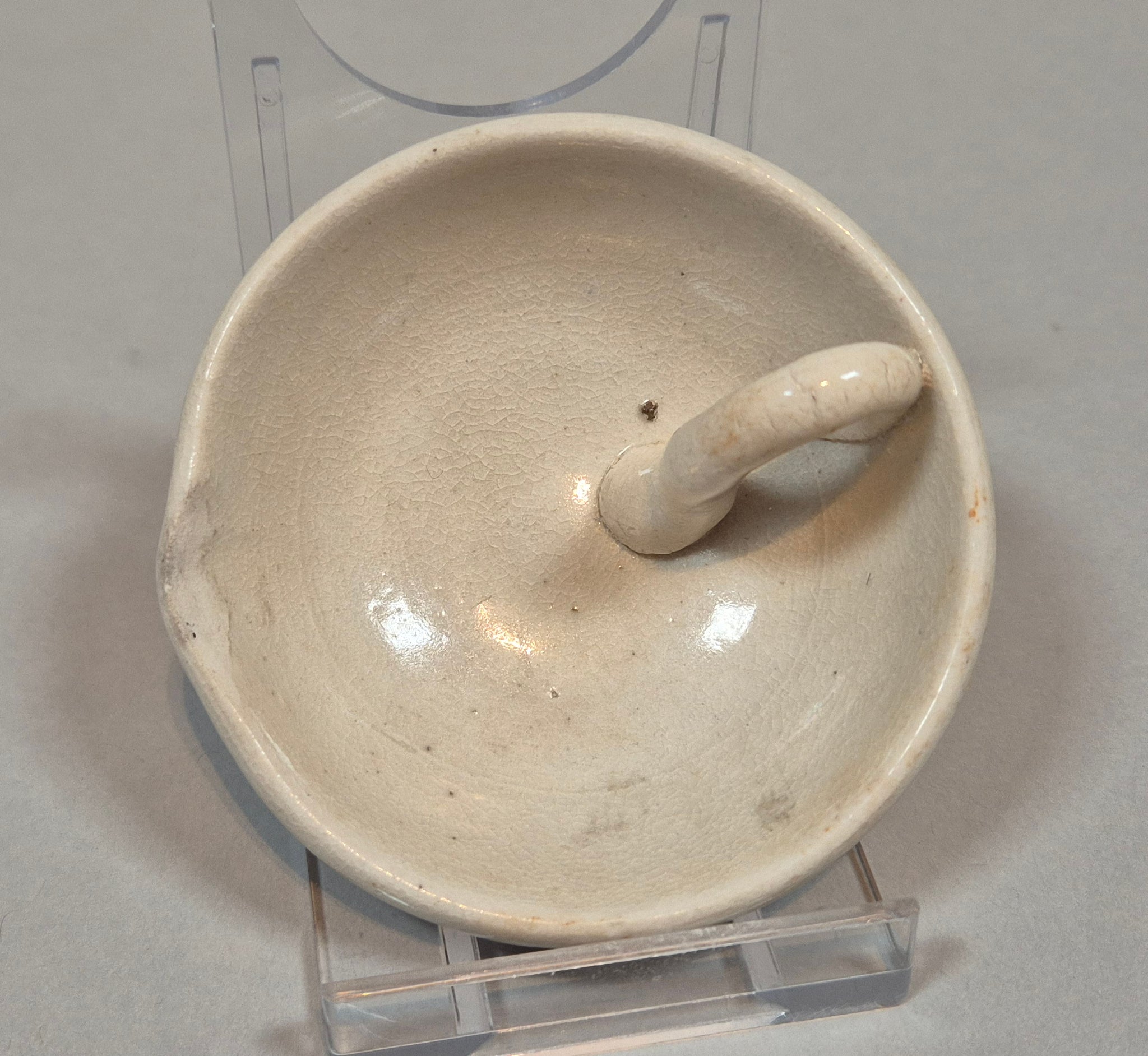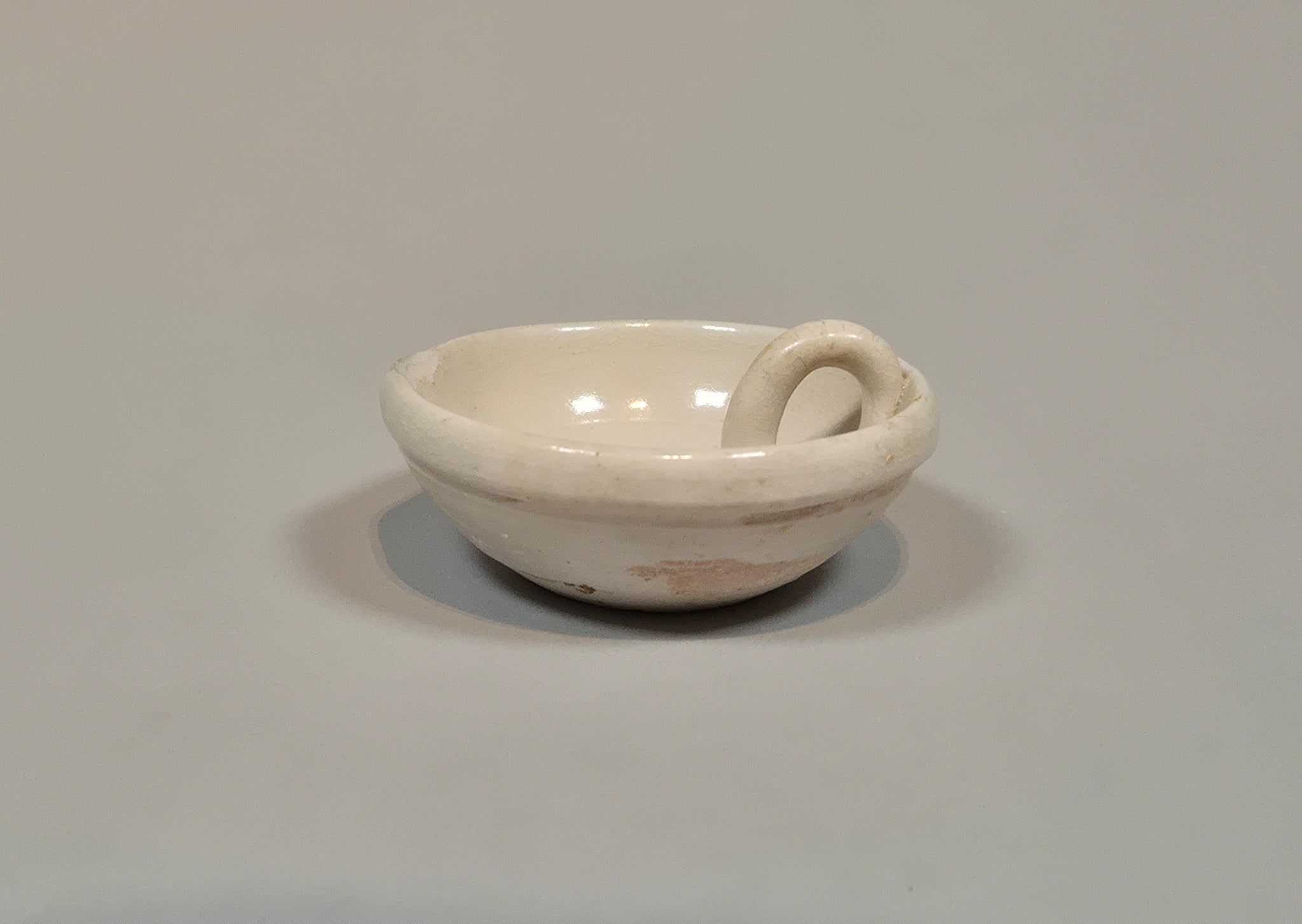 With rounded sides rising from a flat base to a lipped rim. It is set with a handle attached to the inside of the vessel, and a subtle spout on the opposite side. The relatively thick body is white and high fired, and it is covered overall in a transparent glaze except for the lower part of the outside body and the base. The hard white body and the characteristics of the glaze suggests this could be an early Ding product or possibly from Gongyi kilns, Henan. This design was produced by kilns in Hunan and Sichuan in the Tang and Song dynasties and are often referred to as an oil lamp.