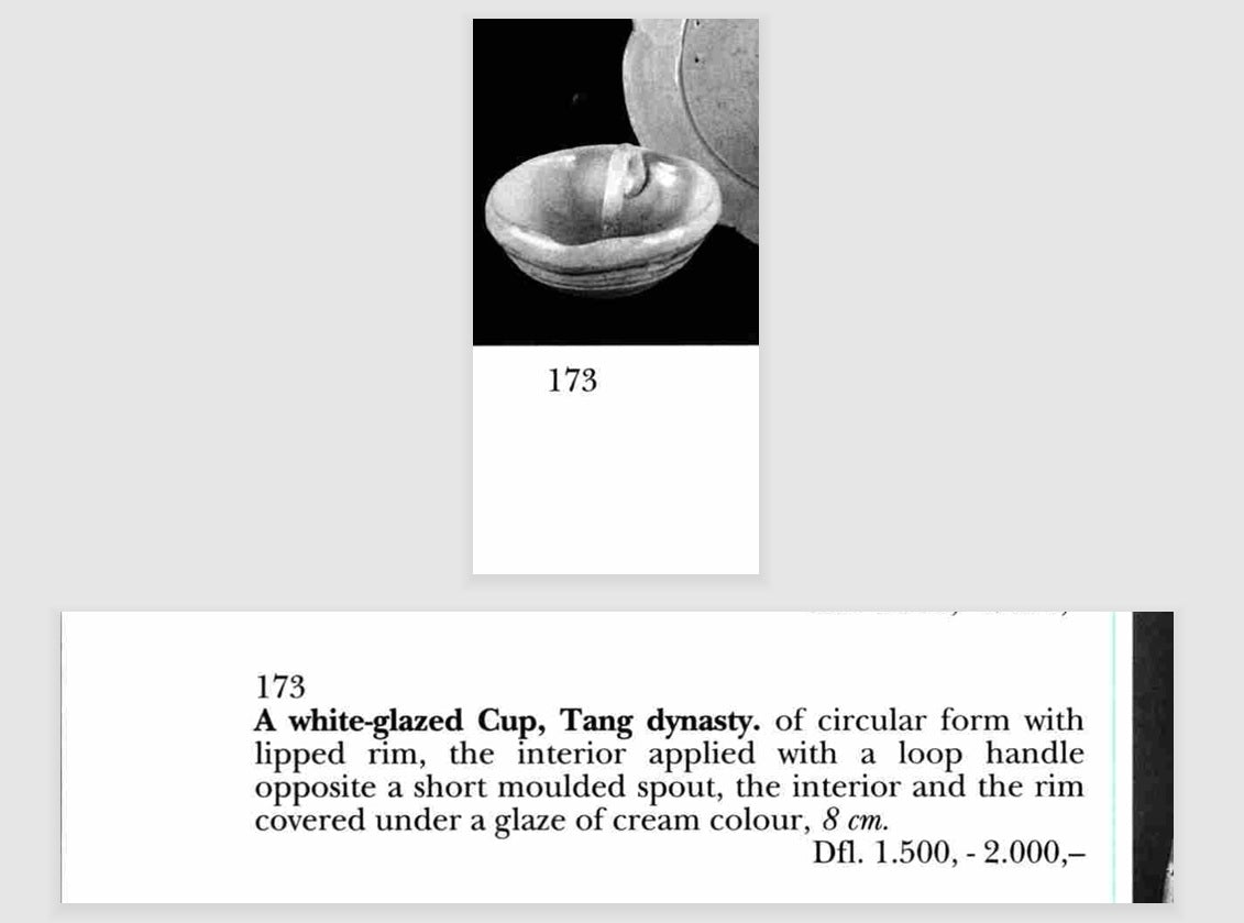 With rounded sides rising from a flat base to a lipped rim. It is set with a handle attached to the inside of the vessel, and a subtle spout on the opposite side. The relatively thick body is white and high fired, and it is covered overall in a transparent glaze except for the lower part of the outside body and the base. The hard white body and the characteristics of the glaze suggests this could be an early Ding product or possibly from Gongyi kilns, Henan. This design was produced by kilns in Hunan, Zhejiang and Sichuan in the Tang and Song dynasties and are often referred to as an oil lamp. The inside spout has been left unglazed to properly hold the wick in place (see photos).