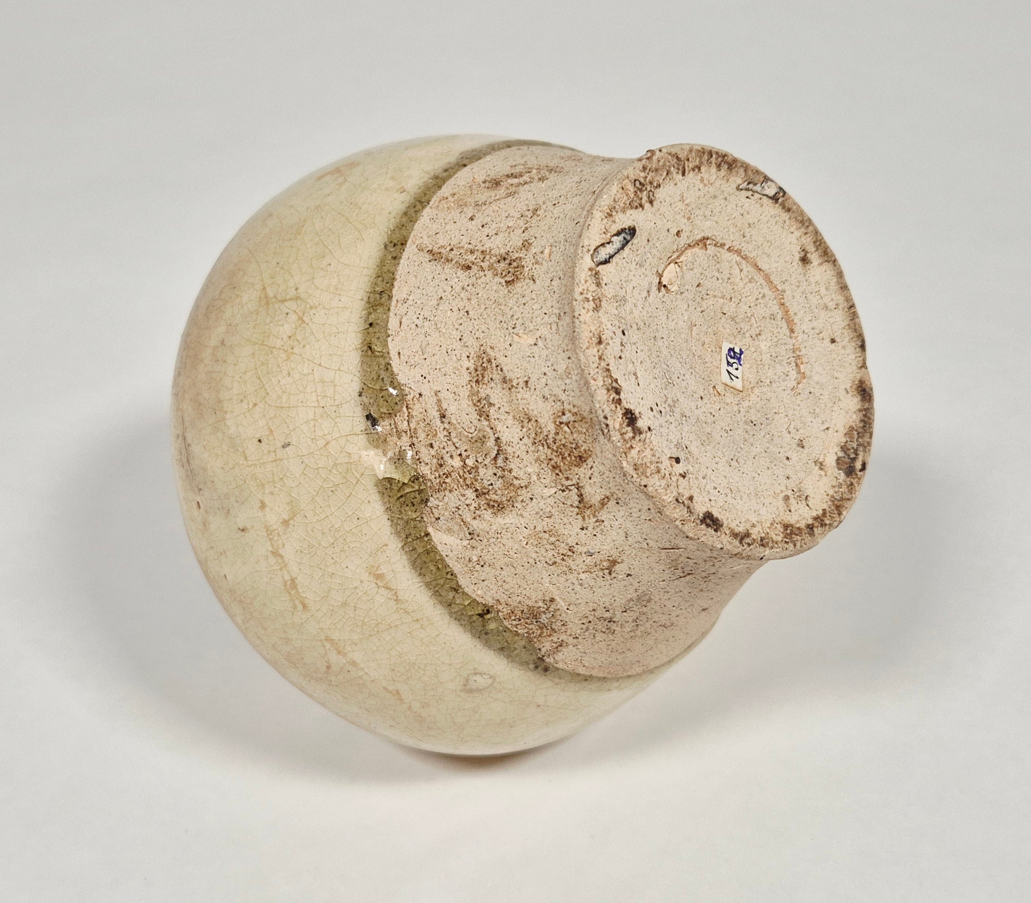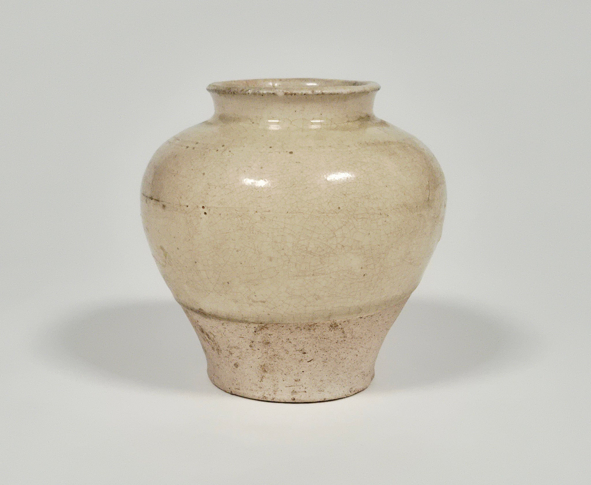 The broad baluster body rising from a slightly splayed, flat base to gently rounded shoulders surmounted by a waisted neck and everted rim. The upper part is covered in a clear, pale-green glaze over a white slip, stopping on the lower part of the body to reveal the buff body. This shape was popular in the Tang dynasty, and these jars were fired in many northern kilns. They were produced with various glazes and of a wide range of quality.