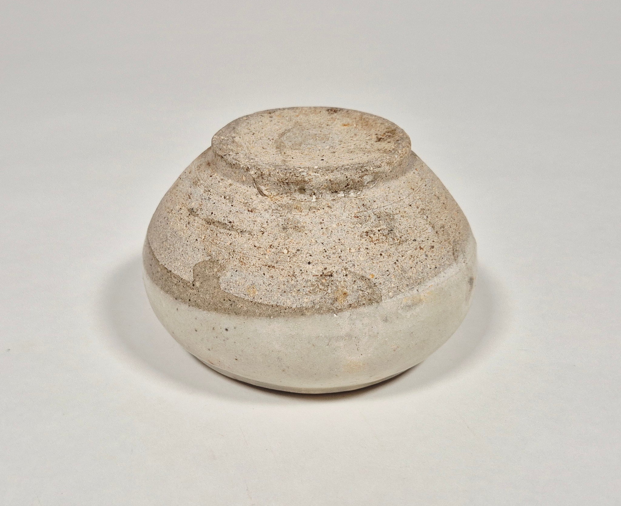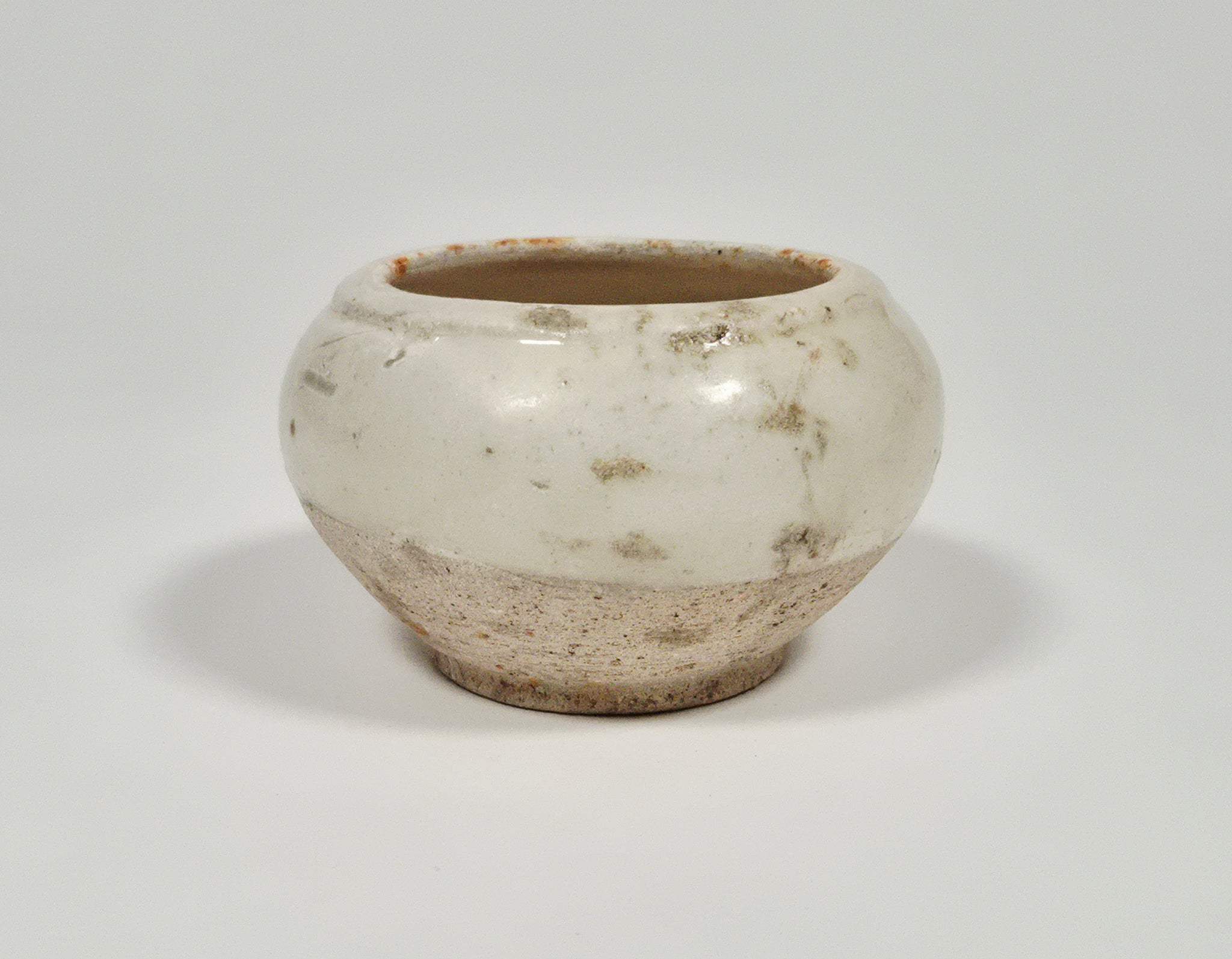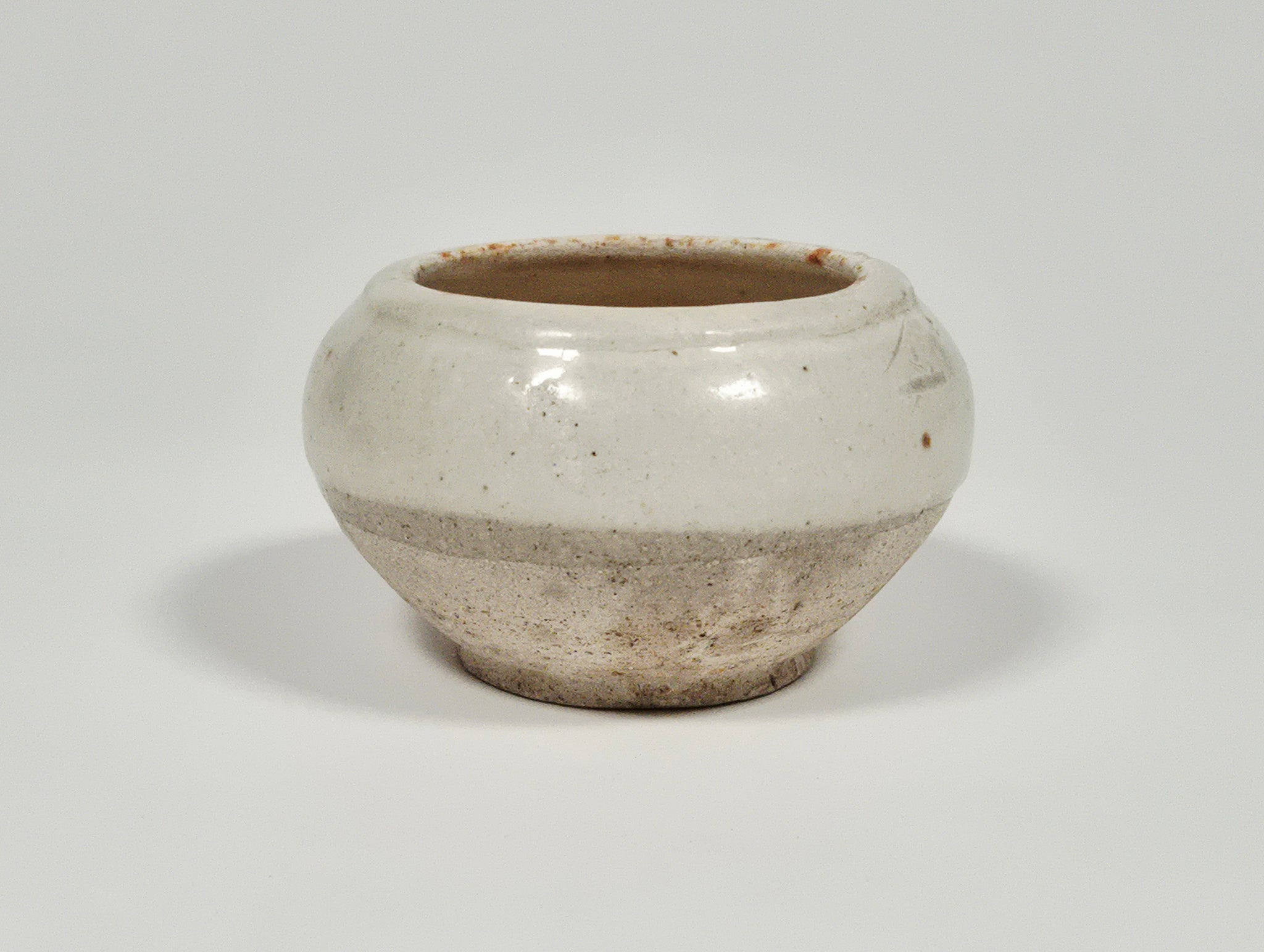 This bowl-shaped jar has a constricted mouth with rounded lip, sloping shoulders and a bulging belly. The hard, slightly coarse, body is greyish white. The flat foot is slightly concave. Both the interior and the upper part of the exterior are coated in a white slip and covered in a transparent glaze. The lower part of the outside body and the base are unglazed. These jars have been found in the excavations of the Xing kiln sites and can be dated to mid Tang.