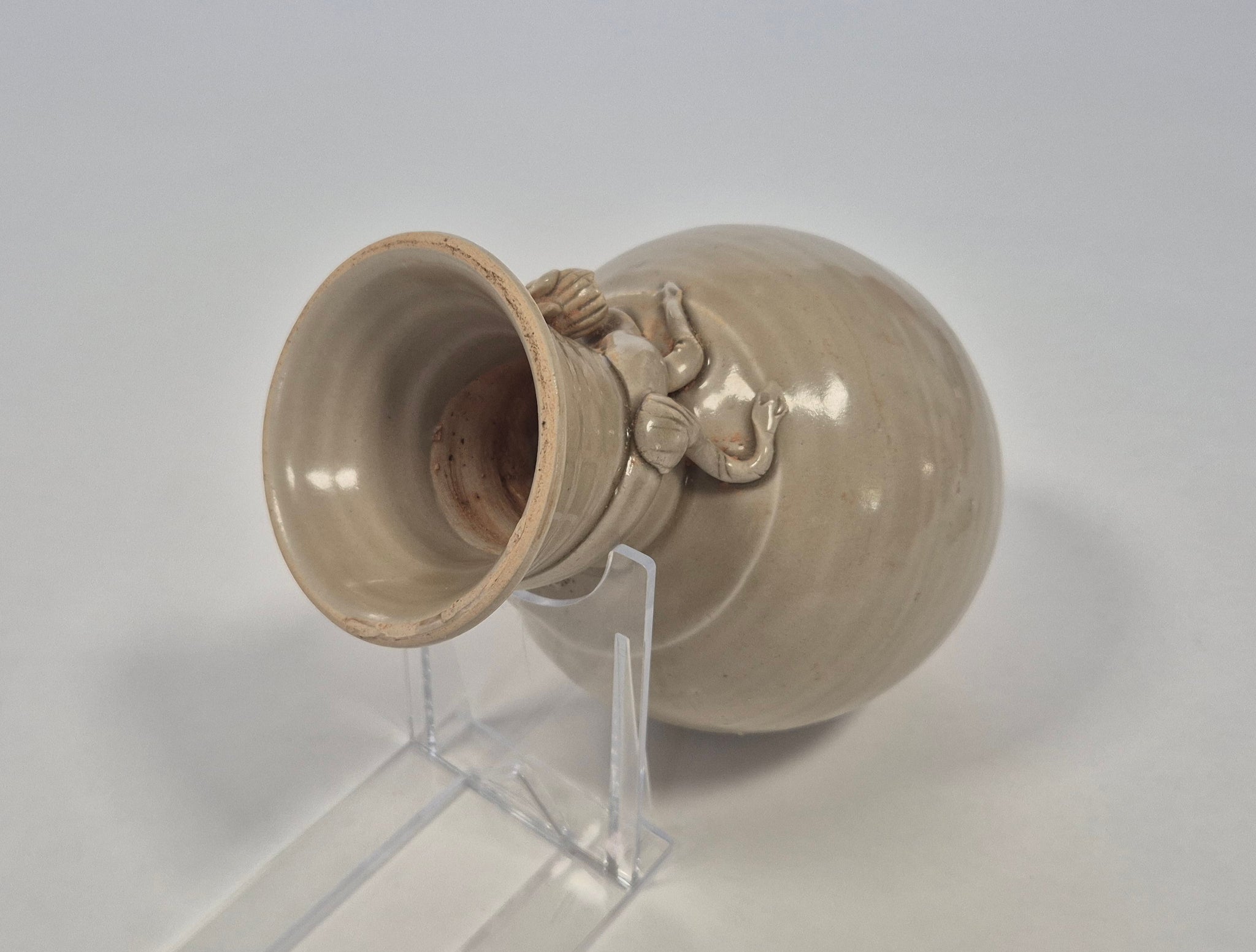 With a bulging belly, a long neck tapering inward, and a straight foot. A dragon figure has been applied around the neck. The doomed cover has a flat rim. Covered on the outside in a greyish-green lustrous glaze. It was probably produced in Fujian.