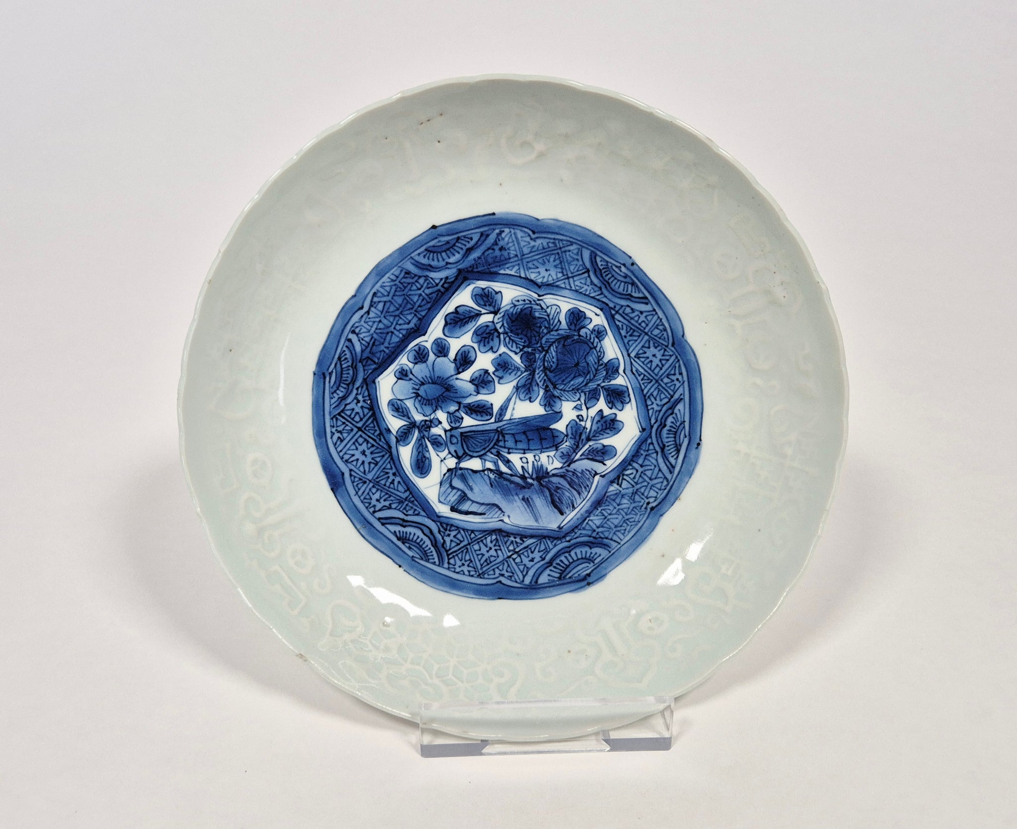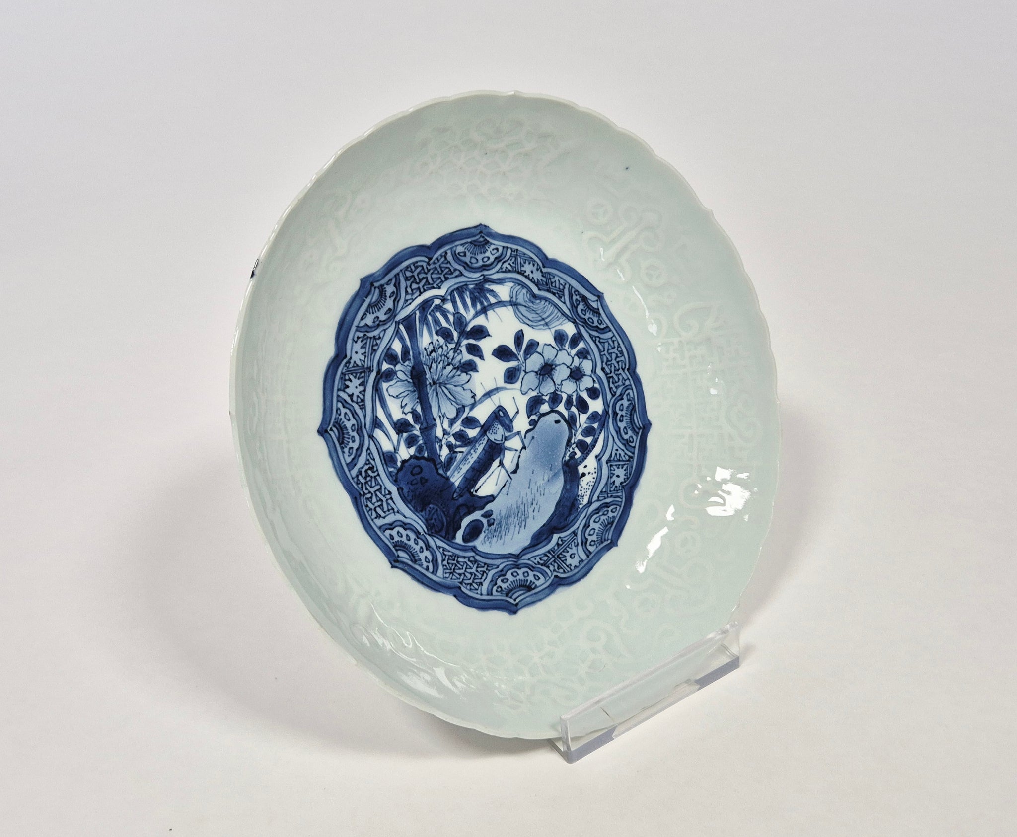 This thinly potted dish has shallow rounded sides rising from a short ring foot to a barbed rim. Painted to the well in bright shades of blue with a medallion enclosing a grasshopper among flowers, leaves and rocks. The interior sides are moulded in relief with flowers and ruyi heads.