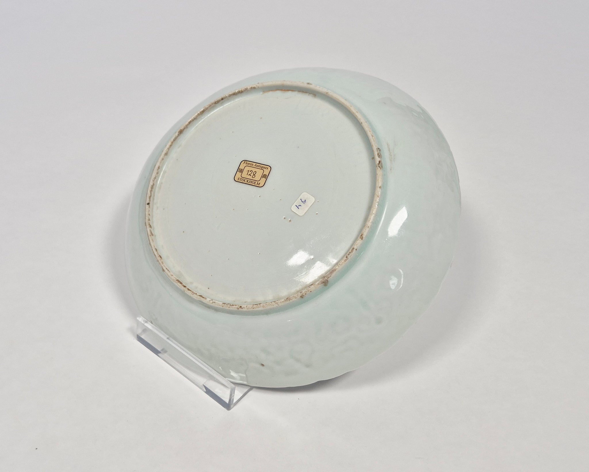 Blue and white dishes and bowls with moulded decorations of this type have been found in Jingdezhen, confirming production in these kilns. Similar examples were also recovered from the wrecks of the San Diego (1600) and the Witte Leeuw (1613).