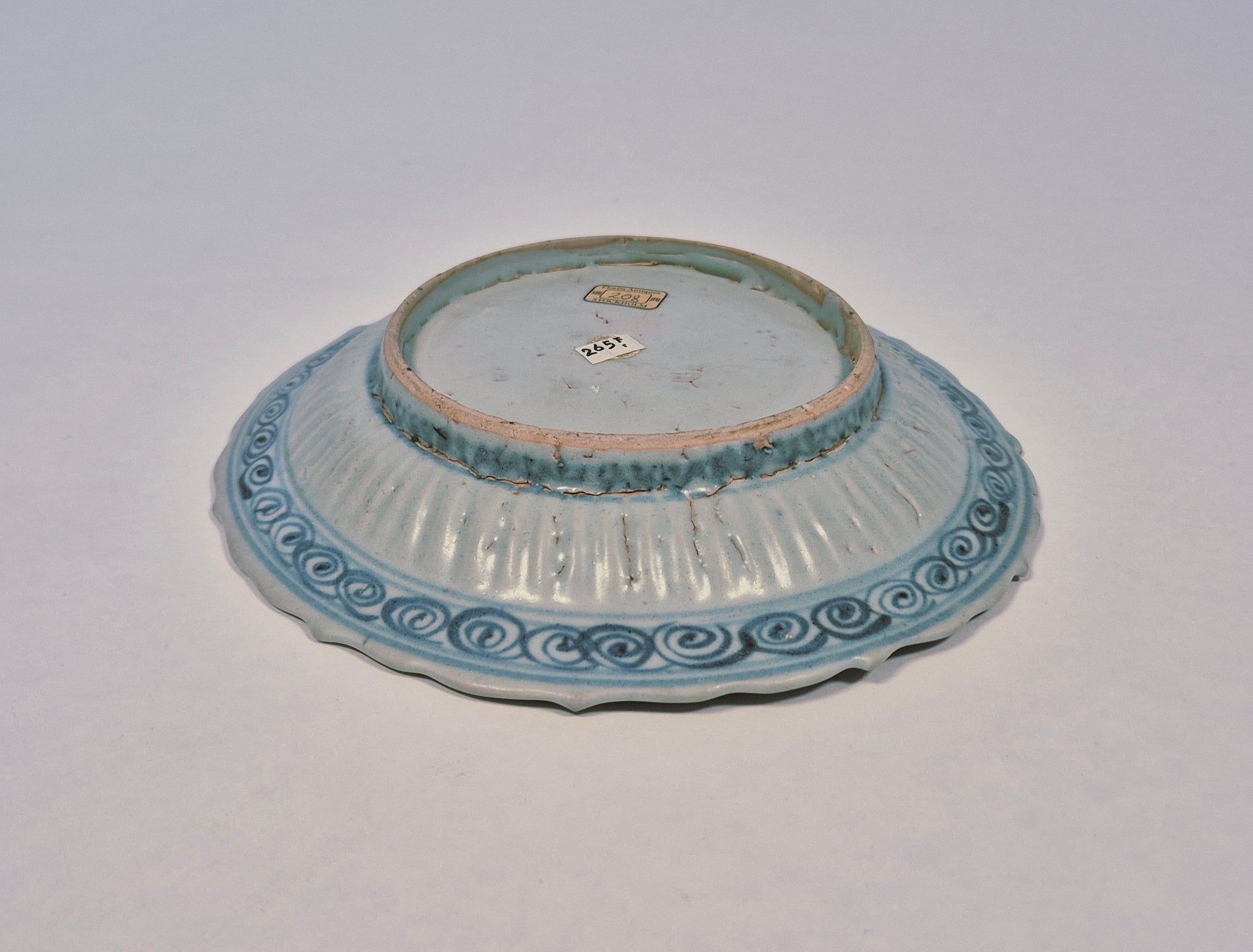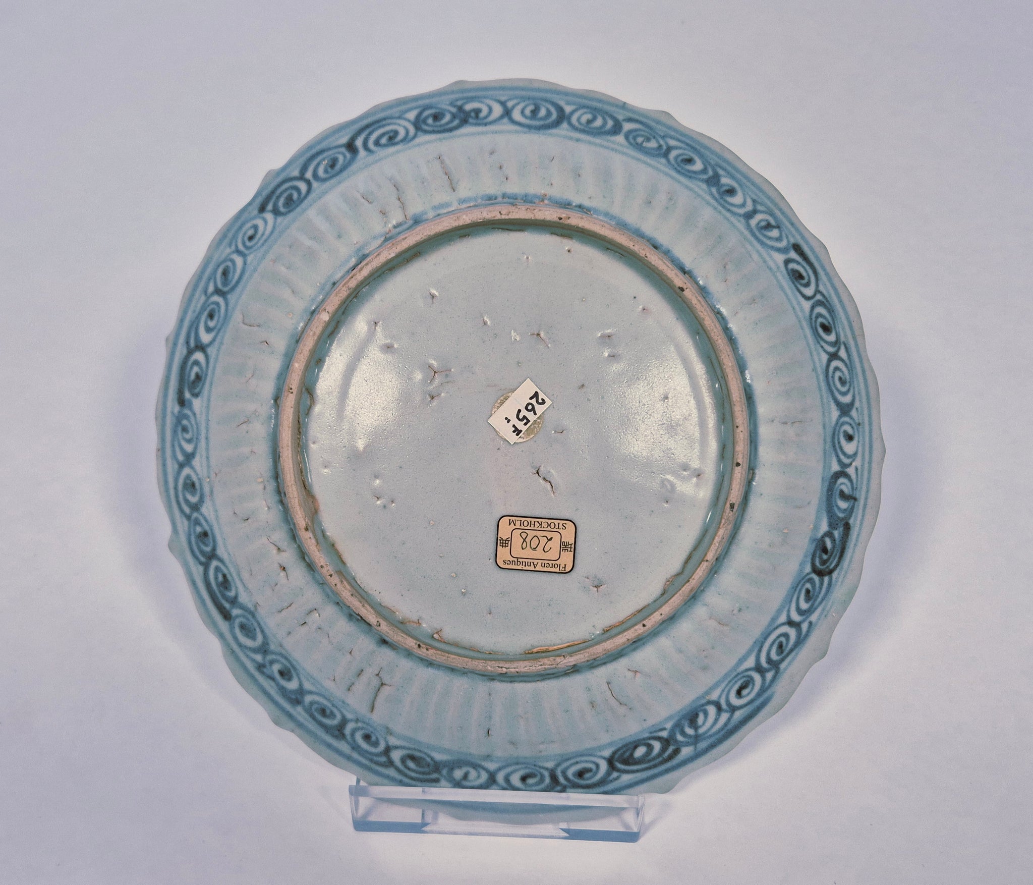 With a distinctive barbed rim and elegantly fluted inner walls, decorated with a Qilin looking to quarter moon. Borders decorated with flowers and simplified clouds with compartments of Buddhist symbols. The painting on this example is particularly detailed compared to other dishes of this type.
